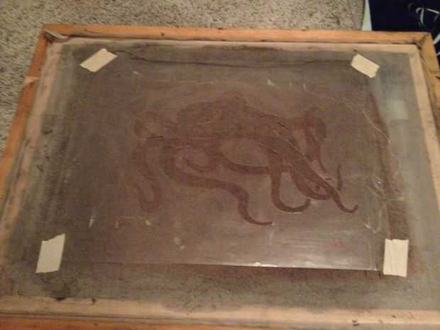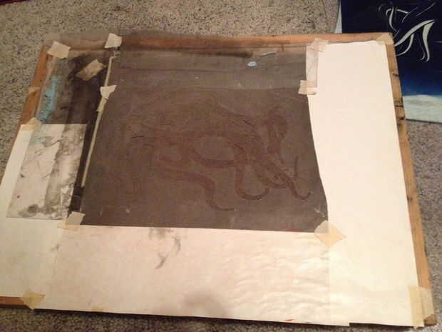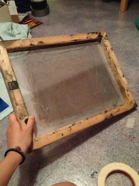Próxima cinta abajo de la plantilla. Usar cinta adhesiva, ya que es más resistente a la agua que la cinta scotch pero todavía pela apagado de la pantalla sin dañarla. También cubre todas las otras áreas de la pantalla expuesta. Todo el espacio negativo o áreas abiertas de la pantalla permitirá la tinta a ser empujado a través de. Normalmente utilizo repuestos rectángulos de papel de contacto, o un periódico doblado para cubrir las áreas abiertas de la pantalla.