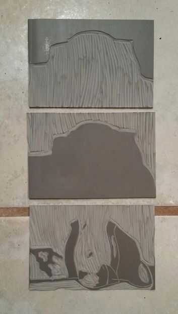 • Una vez que han venido abajo su diseño en los colores que desea utilizar, transferir el contorno de cada color sobre un bloque. Si no quieres al globo ocular de su trabajo, inserte una hoja de papel de transferencia entre el bloque de linóleo y el diseño, luego trazar sobre el diseño con un lápiz o pluma. Esto transferirá una réplica exacta de su diseño inicial en el linóleo. Repita este paso para cada color. Ver la foto arriba para ver los bloques de diferentes colores utilizados para esta impresión particular.
