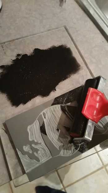 • Usando una espátula, mezclando palo, cuchara o herramienta similar, tomar una cucharada de la tinta de impresión y aplicarlo a una superficie plana. Me gusta usar Plexiglas porque hace para una fácil limpieza después. Las fotografías aquí fueron tomadas de una impresión diferente que hice, pero ilustran el mismo principio.