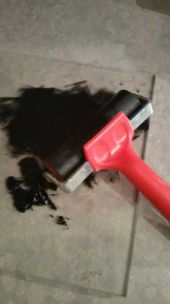 • Tomar el rodillo y rodillo sobre la tinta. Empujar la tinta en diferentes direcciones hasta que has flatted en una superficie delgada, coriácea y ha cubierto el rodillo en una capa uniforme de tinta.