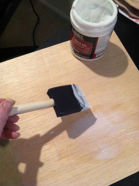 Con un cepillo de espuma, aplicar el medio de gel uniformemente, pero no demasiado espesa. Si es demasiado fina, la impresión no se adhieren a la Junta en lugares. Si lo haces demasiado grueso, que va gastando mucho más tiempo bajar el papel (aunque si pudiera elegir entre los dos, elijo el último). Puede probar esto en piezas de desecho de madera por adelantado o simplemente improvisar. En serio, no tengas miedo de este paso.