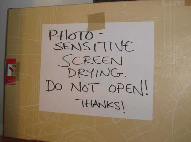 Repita este proceso hasta tener un fino, incluso capa de emulsión que cubre toda la pantalla. (Esto no debería requerir la pantalla de los bancos más de un par de veces, desea trabajar rápidamente para reducir al mínimo la cantidad de tiempo que la emulsión sensibilizada está expuesta a la luz). Hacer el último paso que se separa en el interior de la pantalla, para que tenga una superficie lisa para la difusión de la tinta más adelante.