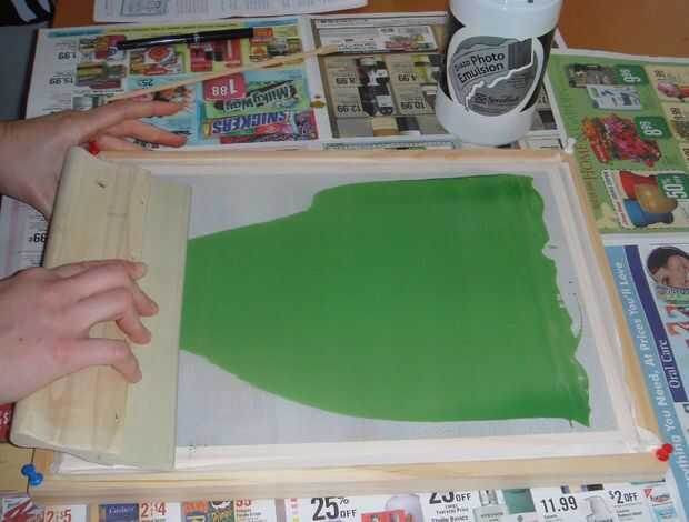 Comience con el lado (plano) del inferior de la pantalla para arriba. Echar (o pasta, según sea el caso) una línea gruesa de emulsión en un extremo de la pantalla. Use la rasqueta para extenderlo uniformemente sobre toda la pantalla, haciendo una capa delgada. Voltear la pantalla y sobre los cuatro pines de presión. Vierta otra línea gruesa de emulsión en un extremo del interior de la pantalla y extenderlo uniformemente sobre la pantalla con la escobilla de goma.