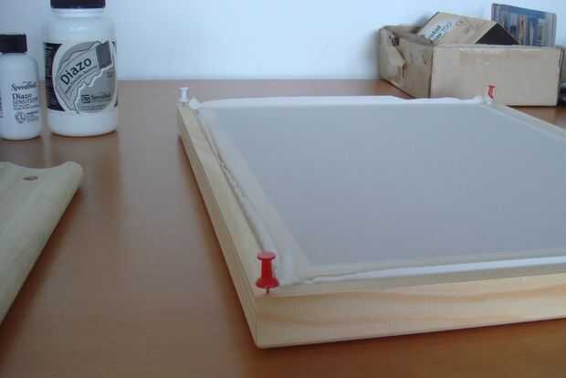 Puesto que usted va ser bancos la pantalla varias veces durante este proceso, seguir adelante y poner una tachuela en cada esquina de la parte (plana) de la pantalla. Así, puede voltear la pantalla y ponerlo mirando hacia la parte inferior abajo sin conseguir emulsión por todas partes. También, si no tienes una escobilla de goma, puede utilizar un pedazo de cartón semi flexible, que tiene un borde ancho, recto, liso para separarse.