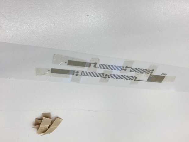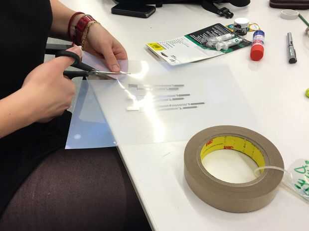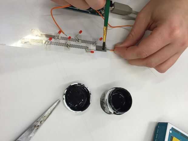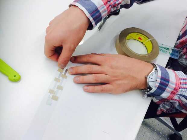 Conectar los elementos (LEDs) para el circuito impreso. Utilizamos cinta conductora (http://nl.rs-online.com/web/p/conductive-adhesives/0496265/), pero también es posible utilizar pegamento conductivo (http://nl.rs-online.com/web/p/conductive-adhesives/2209928/), o para hacer tu propio pegamento conductivo ( Utilizamos el pegamento conductor caseros además a la cinta.