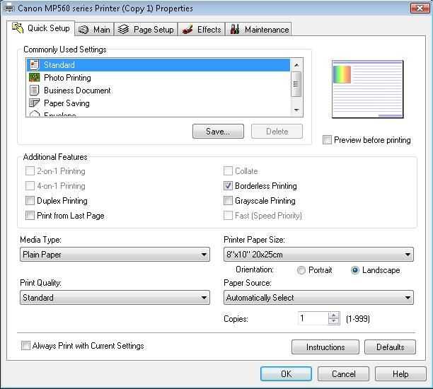 Configuración estándar, papel normal, calidad de impresión estándar (tamaño del papel y la fuente se abordarán más adelante).