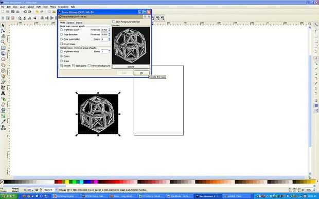 Las dos primeras partes de este se pueden hacer en cualquier programa de pintura. Guardar el resultado e importarlo en Inkscape.Select y en el menú de "Sendero" elija "Trazar mapa de bits." Seleccione el botón "colores" y ajuste la opción de "pasos" de 2. Ahora tienes un objeto adicional, sentado en la cima de lo que ha importado. En su creación, Inkscape habrá hecho un buen trabajo de adaptación de la forma en forma de vector por lo que se puede escalar sin problemas, así como convertir un color "muy oscuro" y "muy ligero". Desagrupar (bajo el menú "Objeto") y arrastrar las dos piezas de él aparte. Uno de ellos es la forma oscura que desea imprimir; el otro va a ser una caja de color claro, que puede eliminar.