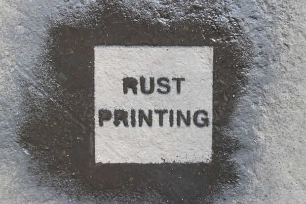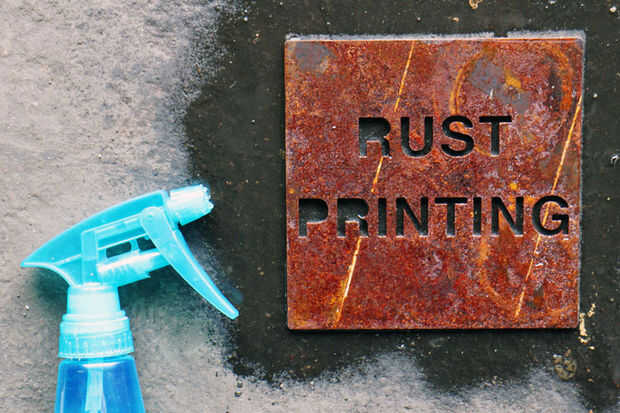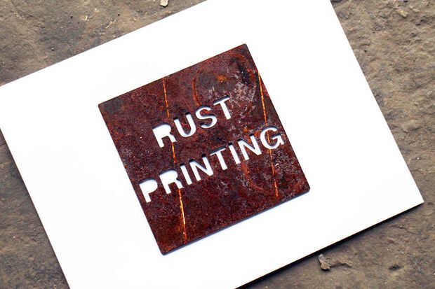 Elegir un material, preferiblemente de un material con una superficie plana. Hacer la forma de metal mojado rociando una combinación de vinagre y agua en la superficie. También puede espolvorear sal sobre la superficie para acelerar el proceso. Vinagre y sal tienen la capacidad para obtener el óxido el metal así que se consigue en - o en el material. Coloque la forma metálica en la parte superior del material. Se puede colocar algo pesado encima para asegurarse de que permanece en el material.