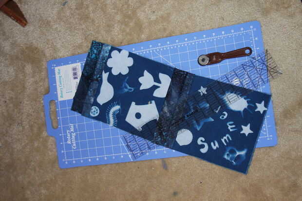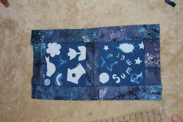Cortar a tela varias tiras de unos 2.5-3 pulgadas de ancho el tiempo suficiente para ir en el medio y a lo largo de los lados de los cuadrados. Coser una tira en la parte superior de las plazas, luego coser los dos cuadrados para formar una sección larga con una franja en el medio. Luego cosí 2 tiras largas en los lados abiertos. Que cortada y el cuadrado de lados, presionando las costuras entre los pasos.