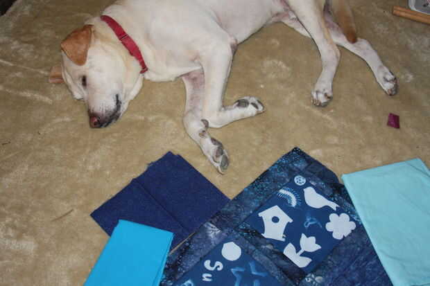 Elegí a la tela de fondo con la ayuda de un poco de uno de mis "ayudantes" que tienen dentro antes, aunque creo que estaba un poco aburrido con tabla de planchar y coser piezas de este proyecto.