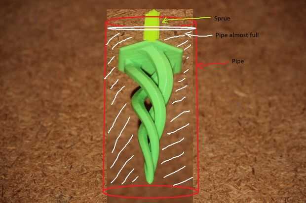 Primer paso aquí es colocar una 'colada' como puede verse en verde encima de la impresión. La fundición ofrece el camino para el metal fundido en el molde.