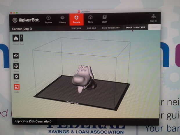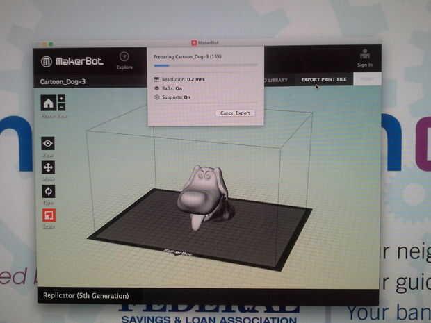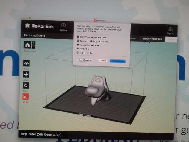 Una vez que estés satisfecho con las opciones que ha hecho para la impresión, exportar el archivo a un USB para la 5 º generación de Makerbot. Aquí es donde usted aprenderá cuánto tiempo tardará la impresión. Si el modelo necesita ser cambiado (para disminuir el tiempo de impresión, o para agregar o eliminar balsas, etc.), usted necesitará volver a pasos anteriores para realizar cambios. De lo contrario, continuar permitiendo que la exportación se realice. El archivo exportado tendrá que guardarse en una unidad USB.