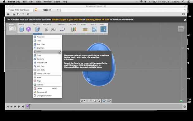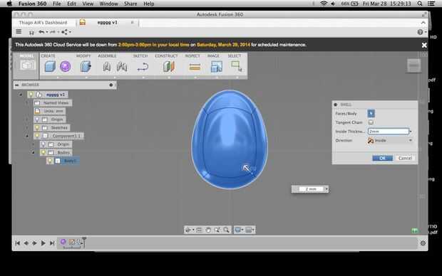 Luego, apago ese formando un hueco con el comando de Shell. Es en el menú modificar, y para el hueco de un cuerpo, tenía que asegurarse de que no se marca la opción de cadena tangente (Tangent) antes de el cuerpo hueco. Después de eso, es fácil. paredes de 2mm, dentro de la dirección... hecho!