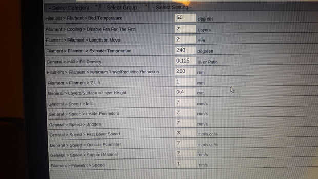 Usted puede jugar con algunos de los ajustes, como la altura de la capa, proporción de relleno, pero los valores de velocidad son críticos.