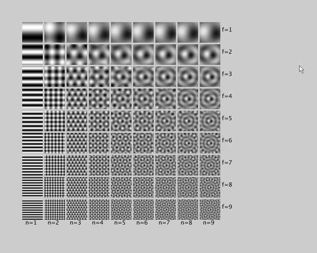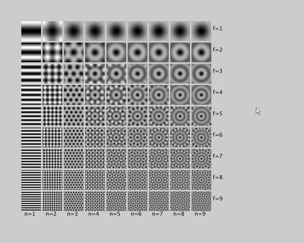 Si bien hay una gran variedad de quasicrystals incluyendo embaldosados de Penrose y los patrones de difracción de rayos x, los que estoy usando aquí se generan mediante la suma de ondas planas. Imagine una onda sinusoidal plano: se ve como cartón corrugado pero se extiende hasta el infinito. Si pones algunos de éstos junto con las ondas en diferentes ángulos y suma todo, se obtiene un quasicrystal. Aquí es un blog que ilustra la idea. Para ver las clases de patrones que se pueden generar, he creado algunos patrones de prueba con diferentes números de ondas planas en diferentes frecuencias. Aquí, n es el número de ondas de diferentes planas,: la fila izquierda es n = 1 donde hay solamente una sinusoide que no es muy interesante. "f" es la frecuencia o el número de ondas que caben en la Plaza. La fila superior muestra f = 1 donde sólo un ciclo de ajustes en el cuadro. Cuando proceda hacia abajo, es como el zoom como ciclos cada vez más visibles.