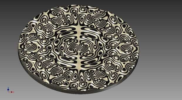 La superficie 3D básica no era que interesante, así que experimenté con algunas maneras diferentes para llevar a cabo la estructura interesante en la forma 3D. Algo que parecía prometedora era cortar la superficie de una pila de láminas. El objeto resultante rayas como un mapa topográfico del terreno.