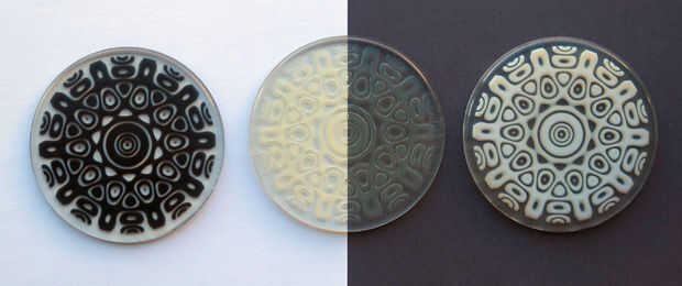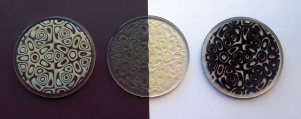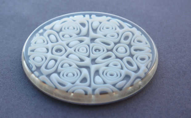 Para cada forma representa la superficie quasicrystal, luego que otro sólido prestados que era un disco con bordes redondeados con el quasicrystal restado. Si estos se imprimen juntos, el quasicrystal llenar el vacío en el disco y hacer una unidad sólida. Esto imprimí con resina opaca blanco y negro rodeada de resina transparente. Esto funcionó bastante bien: el negro le da más contraste, pero el blanco hace que más de la estructura 3D visibles. Como un experimento, imprime solo el exterior resina transparente sin nada dentro el vacío quasicrystal. El Objet impresoras no pueden imprimir voladizos para llenar los huecos con un material de apoyo, que es lo que puedes ver dentro de los discos del centro de las dos últimas imágenes. El material de apoyo es claro pero tiene un diferente índice de refracción por lo que es visible, también tiene una textura gridlike. Sospecho que el material de apoyo no está diseñado para la longevidad y eventualmente puede amarillo con la exposición Ultravioleta, pero sigo pensando es un efecto limpio y estoy contento con cómo salió.