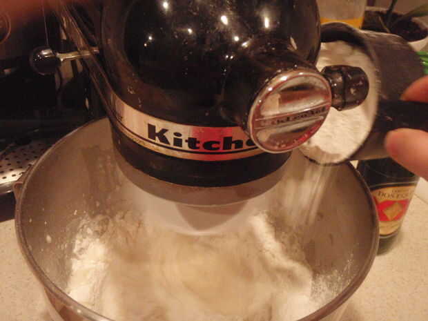 Como se está mezclando poco a poco añadir el restante 1/2 taza de harina.  No se demasiado rápido mientras va o las cosas sólo volará hasta en su cara.  Podrá verse y sentirse como un un agujero.
