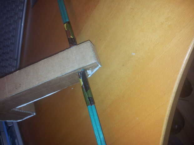 12. luego utiliza una broca con la mano y empujó un agujero a través de la tarjeta para las cañas ir a través y alineados mis marcas de lápiz para conseguir las cañas en el centro