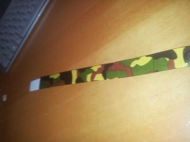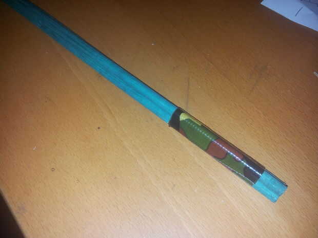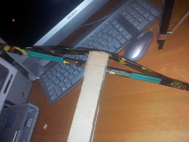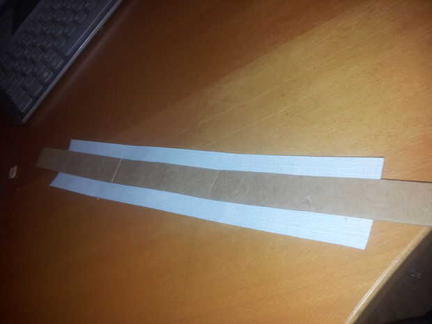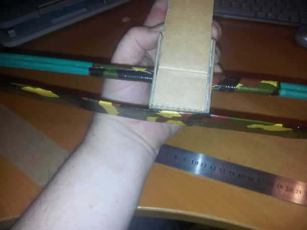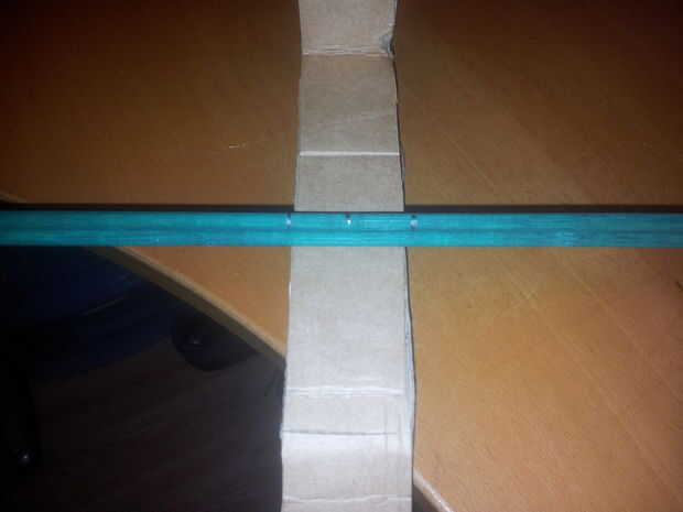 13. el siguiente paso es colocar una correa de sujeción en la parte delantera de la proa, corte una tira de tarjeta de 6" de largo y 1" de ancho y esta cubierto de cinta adhesiva y asegurados en cada extremo y en el centro para dar el arco fuerza adicional también funcionó un pedazo de cinta alrededor de cada uno de los dos lados para evitar que resbale hacia fuera