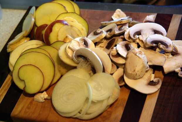Cortar la patatas, cebollas y setas con la máquina de cortar (sin nombre). Si no está utilizando una máquina de cortar, cortar con un cuchillo muy afilado. Deben rebanar verduras todos approxiamtely 1/4" de espesor, pero no es demasiado crítico para sacar la cinta métrica para comprobar.