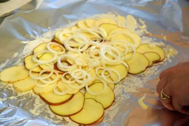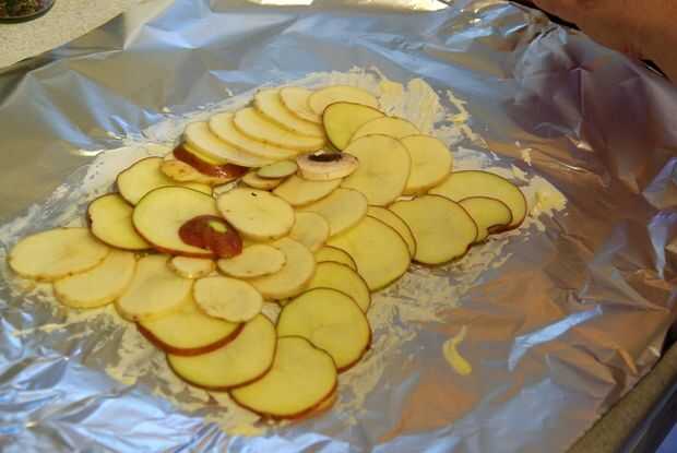 Tenga en cuenta que dos capas deben ser su máxima. Si usted está haciendo este plato para más de cuatro personas, hacer un segundo envase de papel de aluminio. También Recuerde que los ingredientes que terminan en contacto con la lámina se dorarán mucho más que el resto de ingredientes. En nuestro caso, las patatas y las setas se dorarán. Si está añadiendo capas adicionales, considere la posibilidad de que ingrediente quieres dorada cuando averiguar las capas.