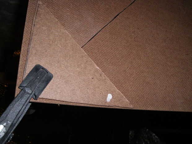Obtener los triángulos pequeños que fueron cortados hacia fuera en el paso 5 y 6 y luego fijarlo con la abrazadera por debajo de las entre los dos flaps.then perforar dos agujeros pequeños a través de las dos capas luego asegúrelo con una pequeña tuerca y perno.