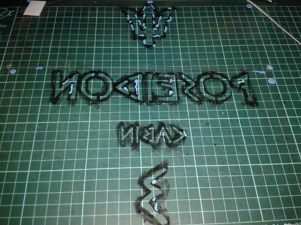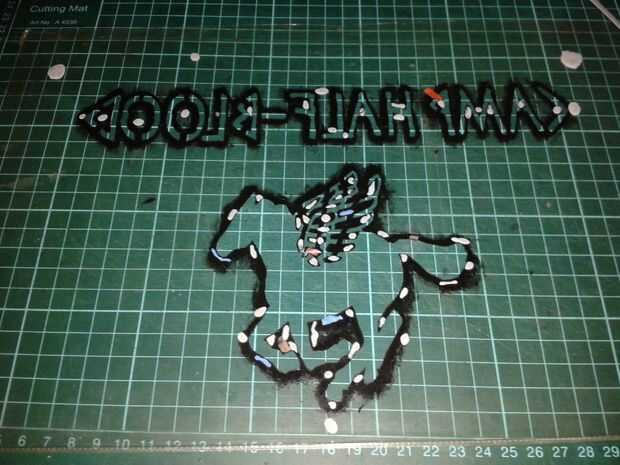 Antes de comenzar a pintar nada, tomar TAC azul y pegarlas en los 4 bordes de la parte posteriora de las plantillas, junto a los bordes de las letras y el tridente. Como se ve en las 2 fotos 1. Esto es para prevenir el movimiento accidental de la plantilla y para asegurarse de que las letras son pintura con tanta precisión como sea posible.