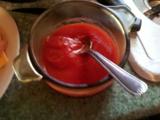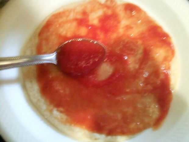 Primero abrir su lata de salsa de tomate (con su abrelatas) y calentar la sauce(optional). Usar la cuchara para repartidas uniformemente en la tortilla. Ahora añadir las especias que elegiste.