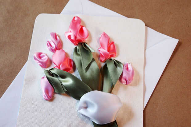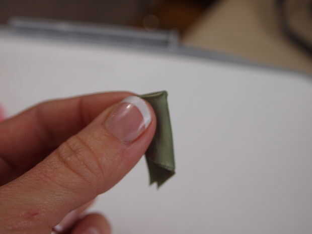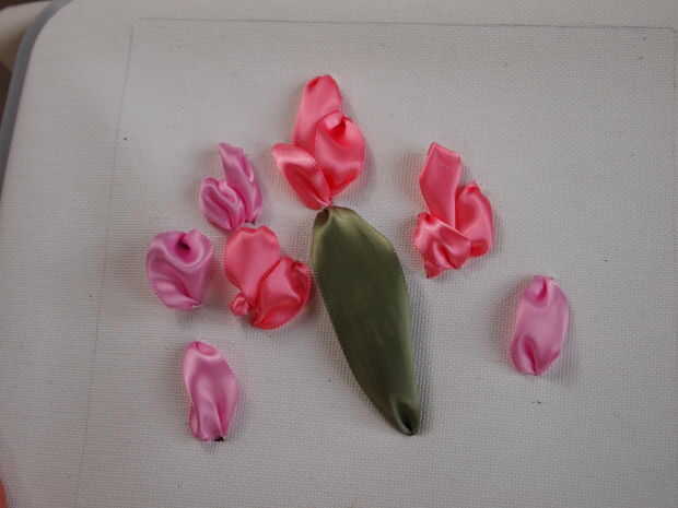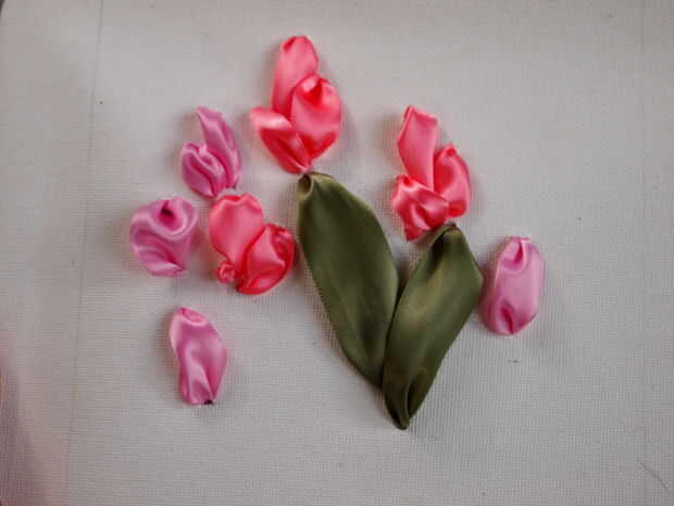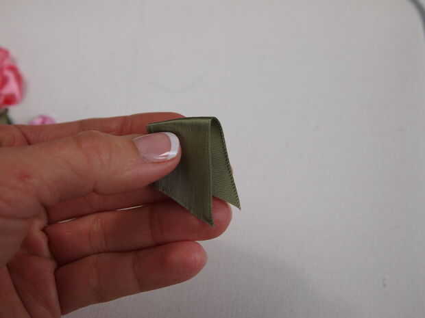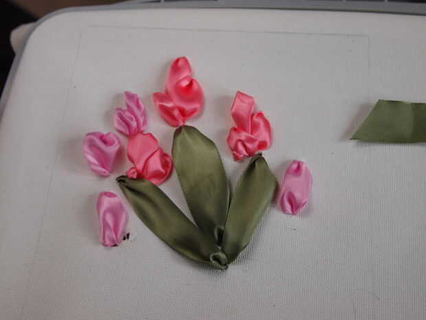A continuación, saqué la cinta verde (y esta cinta es una pulgada de ancho) y utiliza el mismo método para crear los tallos. También, agrega piezas poco tallo u hojas, usted tendrá que cortar unos trocitos de cinta verde. Crear un agujero donde quieres ponerlo y pase la cinta por el agujero (con la aguja o pinzas funciona demasiado) y dejar un extremo que sobresale. Asegúrese de cortar el extremo con las tijeras. Usted puede también coser piezas en si te gusta - que es lo que ves que lo hice en algunas de las fotos. Pero era más fácil meter los agujeros y pasar la cinta. Es totalmente encontrar si los extremos no son seguros en la parte posterior de la tela. Usted pegado a la lona a otra pieza de tela papel - por lo que es aceptable si no es super seguro allí.