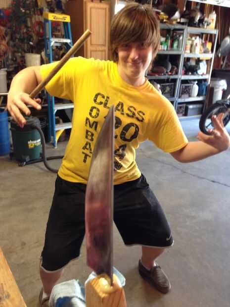 por cierto yo no soy responsable de cualquier daño PS esto no es un juguetePaso 1: hoja de Tomar una lámina de cuchillo de pie y envolver eléctrico cinta de ADVERTENCIA: la hoja es muy muy afilada punta: envolver un montón de cinta alrededor de ellaP