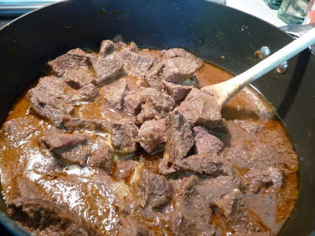 Vuelva a colocar la olla cubierta la estufa y poner a hervir baja a fuego medio. Baje el fuego y continuar a fuego lento hasta que la carne esté muy suave - unas 2 horas.