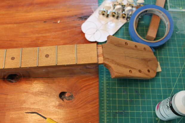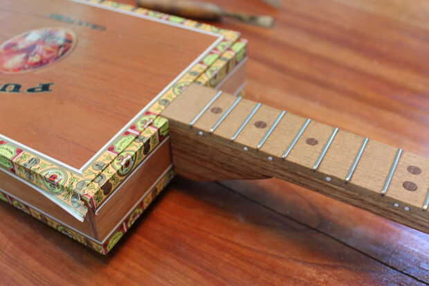 * Nota: Como puede ver, para un poco de estilo, pelada cuidadosamente el interior de la etiqueta de la tapa de la caja de cigarro y pegado hasta el cabezal y acabado sobre ella (image4). También, sin necesidad de cinta sobre tus trastes al terminar, nivele los trastes más adelante y retire cualquier acumulación.
