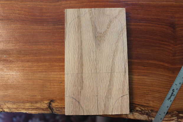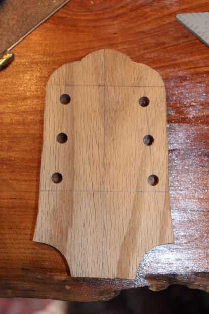 3. yo quería añadir un ligero ángulo hacia el interior a los afinadores. Para ello he hecho dos líneas paralelas de la parte inferior del cabezal en 2 1/4 y 4 3/4". Entonces medí 3/8" en desde donde fuera inferior donde comenzará los sintonizadores. Entonces medí desde la parte superior borde 3/4" en exterior. Sé que esto es un poco confuso pero si hace referencia a la imagen 17 debe tener sentido.