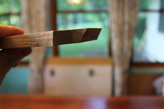 5. usando un trozo de lado pegadas a la cejuela (imagen 8) para hacer el cuadrado de lado, he añadido un ángulo de 30 grados hacia atrás a la parte inferior de la cabeza donde se une el cuello con una sierra de marquetería (más fácil con una sierra para cortar ingletes). Agregar este ángulo (junto con el asignado 2" espacio discutido en el paso 1) permite adecuada de las gotas en la cadena en la tuerca enseñada (imagen 9).