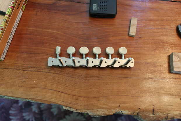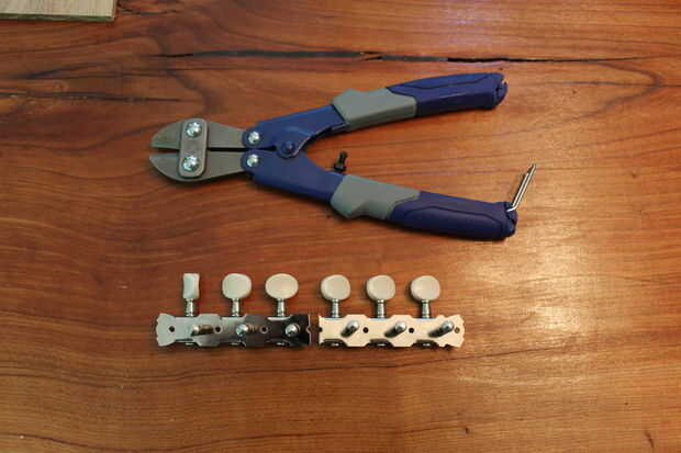 1. haber recogido piezas aquí y allá, mi sintonizadores eran de una vieja guitarra de 12 cuerdas (imagen 13). Simplemente tomé mi Cortapernos y cortar por la mitad y presentó los filos hacia abajo (imagen 14,15).