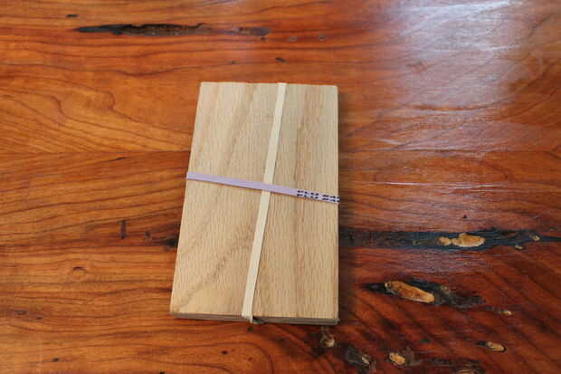 2. para obtener el cabezal para el grosor adecuado corté dos piezas de 6" de largo fuera de mi madera de cabezal (imagen 1). Entonces les pegan y utiliza bandas de goma para mantenerlos alineados (imagen 2). Usted puede sujetar o un objeto pesado para asegurar las dos piezas set plana Junta (imagen 3).