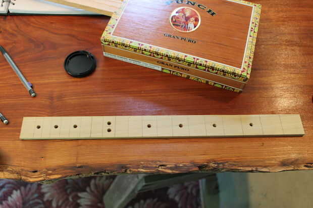 1. seco colocar el cuello en la caja de cigarro y cierre la tapa. Hacer una línea de 1/2" hacia abajo desde el extremo del cabezal del cuello. Luego Mida desde esa línea a la tapa de la caja, esto rinde su longitud de diapasón. Mi medida salió a 18 13/16". (lo siento no hay imagen)
