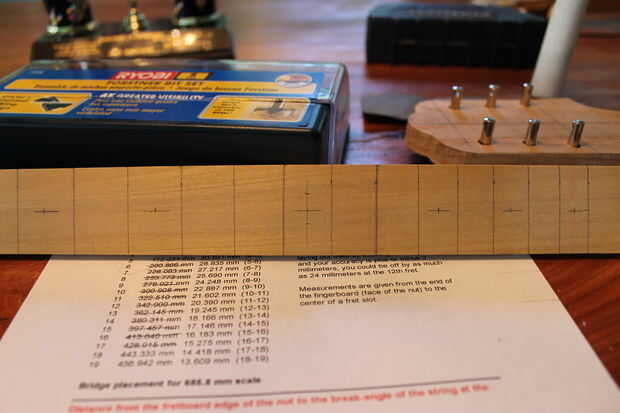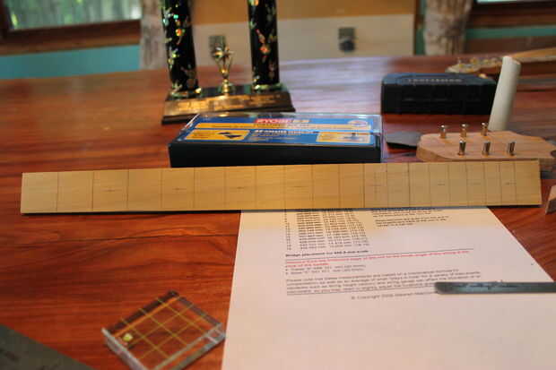 3. puede usar métrico o estándar en el paso anterior pero cualquiera elegir, probar y ser tan preciso como sea humanamente posible dosificar los trastes en su diapasón. Asegúrese de medir de "Fret para tuerca" (el que la parte superior del diapasón) y comprobar su precisión con las medidas de "Traste a traste" en la impresión de SteMac. Usando mi plaza hice líneas verticales para cada traste (imagen 1, 2).
