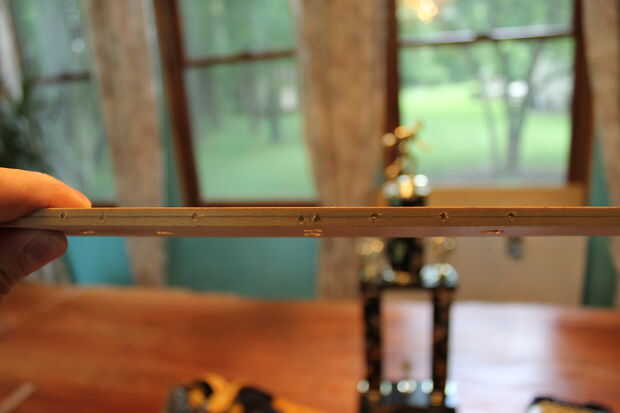2. en vez de hacer un montón de diminutos puntos de madera o de plástico a instalarse, tomé un 3/32" pedacito de taladro y de la mano torcidos un divot en cada marca hecha previamente (imagen 7).