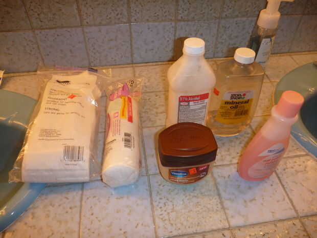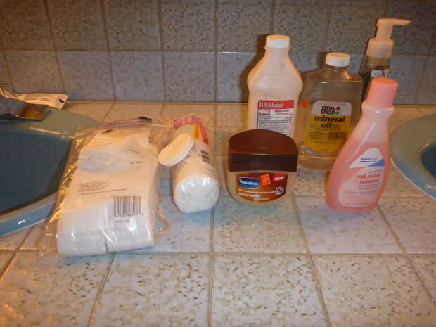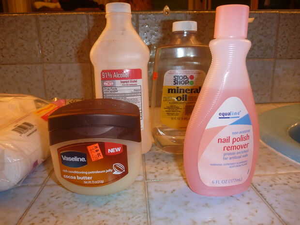 -Algún tipo de alcohol: Que incluye alcohol isopropílico desnaturalizado (o similar) y pulimento de clavo si estás desesperado. Supongo que si tienes algunos moonshine sentados también puede usar eso. Usted puede comprar esto en la sección de primeros auxilios de una farmacia o una tienda de Wal Mart-como.