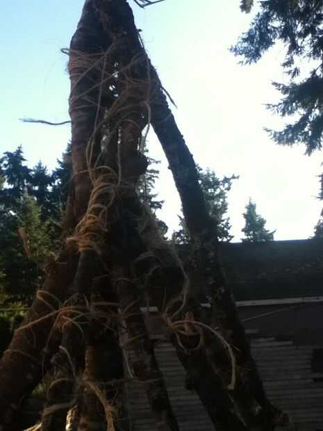 cantar un montón de guita y el empate de escalera de paso todas las tapas de los palos juntos Asegúrese de que son todos de igual distancia de la base. También asegúrese de que los palillos forman un círculo alrededor del palo medio. Asegúrese de dejar espacio para una puerta.