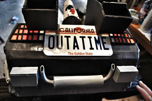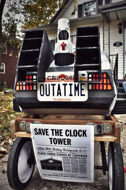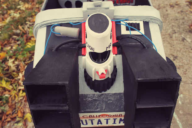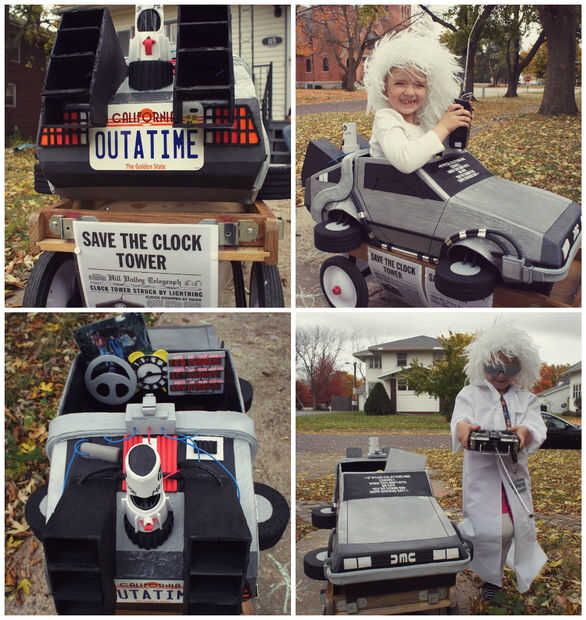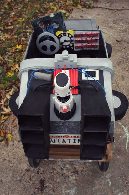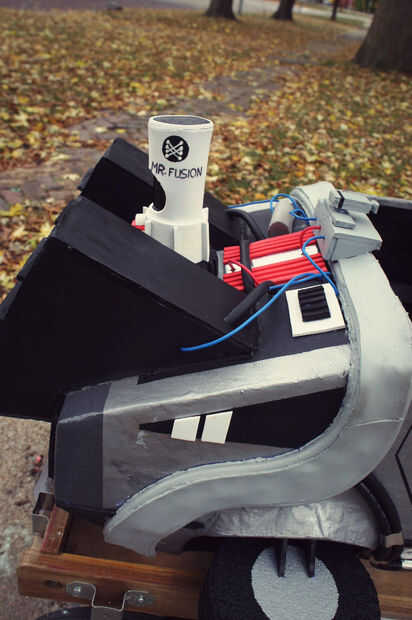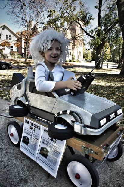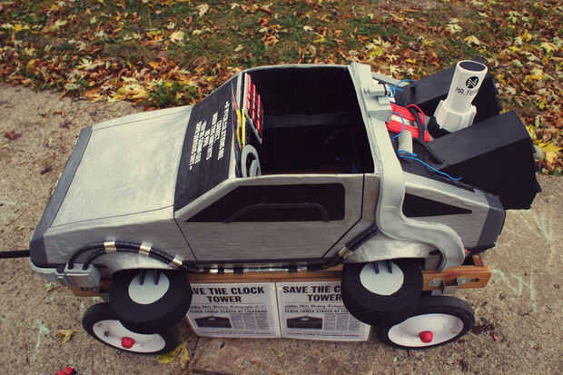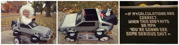 Su papá hizo el Delorean totalmente a mano, con los siguientes materiales: cartulina, papel maché, espuma, hilos, plástico, marcadores y pintura. Había formado de cartón en la forma de un coche y aplica varias capas de papel maché para que sea fuerte. Cuando el papel maché fue completa, pinta el coche entero. El extremo posterior se hace de diferentes colores de espuma, láminas de cartón y cables. La parte delantera del Delorean tiene faros y emblema de espuma, así. Impreso y había laminado varios elementos de la película (aviadores de la torre del reloj) y había colocado en el coche y en el carro. El volante, reloj y tablero de instrumentos se hacen de cartón, espuma y pintura. No hay cable conectado por la pistola de pegamento a los lados del Delorean, así como el tronco posterior. Es usando la vieja ropa/bata, gafas de sol que nos aerosol pintado gris y usando un mando a distancia original. Su padre aplicó una pegatina de una cita famosa de la película para el parabrisas: "si mis cálculos son correctos, cuando este bebé llega a 88mph vas a ver algo serio sh **." And...Yes, el Sr. Fusion tiene un plátano real pelar en él!!!! ¡¡¡Feliz Halloween!!!