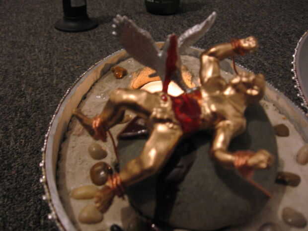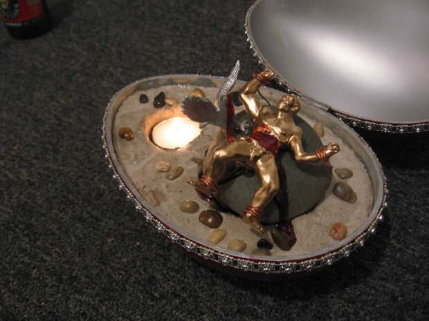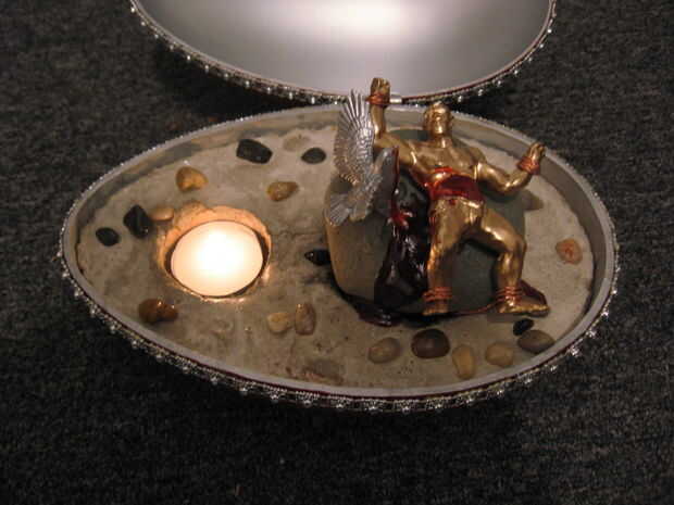 aquí es un huevo que representa el castigo de Prometeo. Era el Titán que robó el fuego de los dioses y lo dio a la humanidad. Su castigo fue ser encadenado a una roca por toda la eternidad y su hígado arrancado durante el día por un ave de gran tamaño (algunos dicen águila de otros buitres. De cualquier manera OUCH!). Regenerar por la noche por lo que podría ir a través de él todo otra vez. Estaba tratando de pensar una manera de usar el fuego en un huevo y este mito parece encajar el proyecto de ley. Además se trata de sangre y las entrañas que es apropiado cuando se acerca Halloween.