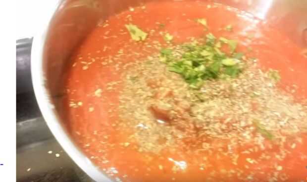 3. Añadir la salsa de tomate y tomate en una cacerola a fuego med a la baja.