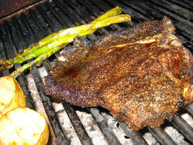 Para preparar a los lados, colocar las papas y espárragos a la parrilla a fuego alto. Hilvanar en aceite de oliva y espolvorear sal sobre. Voltear las papas cuando doren y repita con el aceite de oliva y el mar de la sal. Retire cada una cuando están cocinados a la perfección. Las patatas llevará aproximadamente 40 minutos mientras el espárrago puede tomar unos 5 minutos.