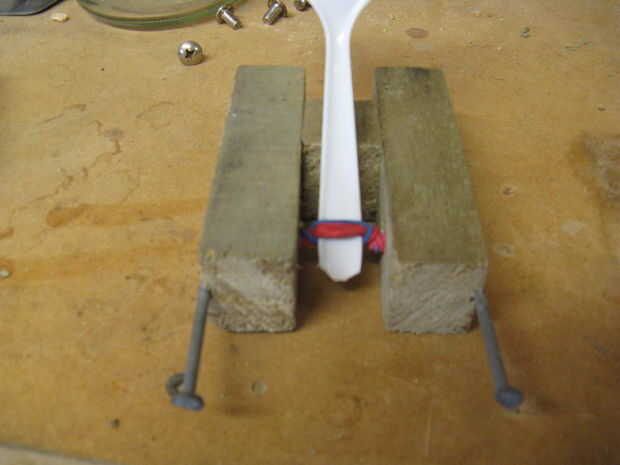 Ahora recortar la parte inferior de la cuchara para que no golpee la superficie descansa en la catapulta.