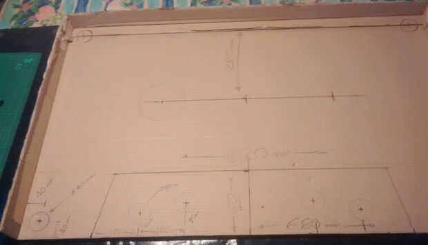 De trazado: Usando el plan que acabamos hizo marque hacia fuera en el interior de cada pieza de cartón. En otro pedazo de cartón marcan las ruedas dentadas (mi dimensiones guardan como notas en el diagrama). No te preocupes de ser perfecto en esta escala la gente no será capaz de decir.