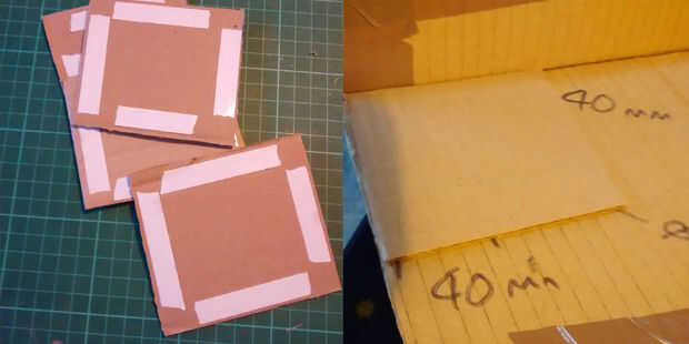 Por último cortar 8 cuadrados de cartulina y pegarlas en el interior de cada esquina. Esto crea los agujeros de tornillo empotrado.