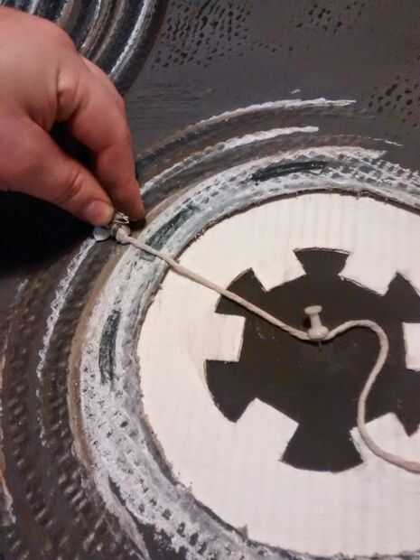 Dibujo los carretes de cinta: Atar un trozo de tiza a una longitud de cadena y utilice un alfiler para crear un punto de pivote. Crear líneas de tiza concéntricos mediante el ajuste de la longitud de cadena. Sólo necesitas sacar el carrete donde no cubra la etiqueta. Agregar detalles adicionales con oscuros pastel/grafito/marcadores.